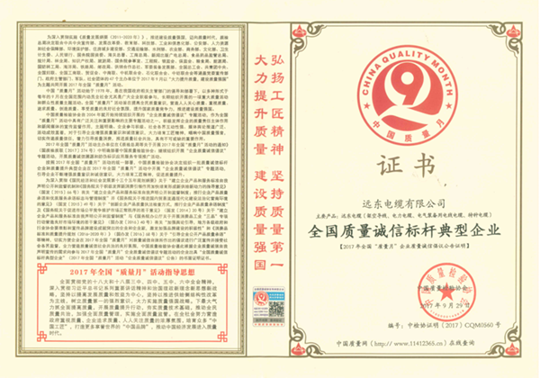 2.远东电缆被评为“全国质量诚信标杆典型企业”
