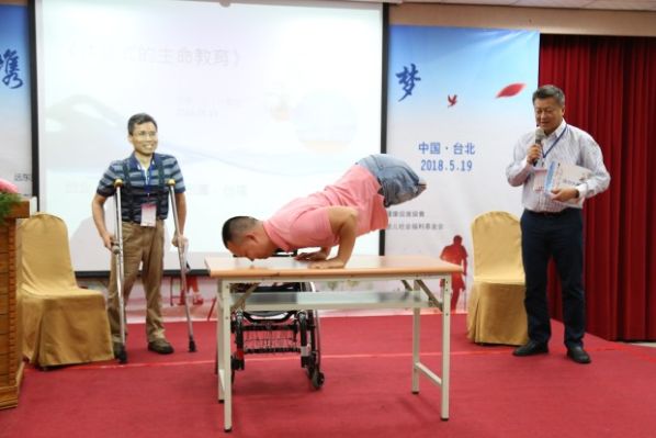 代国宏表示,身障人需要创业,不仅是因为不想成为家里的负担,而且在实现人生价值、实现真正意义上的无障碍生活方面都有十分重要的意义。“我们每个人都需要保持学习的态度,不停学习,不停思考,成为对社会有用的人。”人因为梦想而伟大,我们为自己的梦想奋斗,为别人的梦想努力,为社会的发展奉献自己,代国宏对未来充满理想:“勇敢是幸福的!幸福是奋斗出来的!” 混障综艺团团长刘铭用自己的故事向现场来宾传递了乐观向上的生活态度,坐在轮椅上的他身上看不到一点悲观的影子,“希望两岸每个人对身障人树立起正确的观念,积极面对生活。”自身作为身障人的林进兴不仅用乐观改变了自己的生活,更成立了脊髓损伤潜能发展中心,为身障人们提供基本生活技能培训,为他们筑起生活的信心及希望。