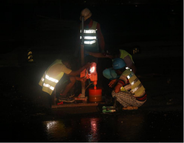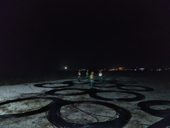 在施工现场,项目部人员为了后续工作的顺利开展,在不停航施工中,以勇往直前,百折不挠的毅力,一夜干完三条联络道的管道线缆敷设任务。