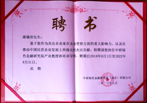 蒋锡培受聘为中研绿色金融研究院产业教授和培训导师