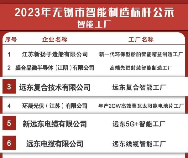 6月6日,2023年无锡市智能制造标杆企业名单公示,远东智慧能源股份有限公司(简称:远东股份 股票代码:600869)旗下三家子公司荣登该名单。其中,远东复合技术有限公司“远东复合智能工厂”、新远东电缆有限公司“远东5G+智能工厂”、远东电缆有限公司“远东线缆智能工厂”被拟定为无锡市智能制造标杆企业“智能工厂”。