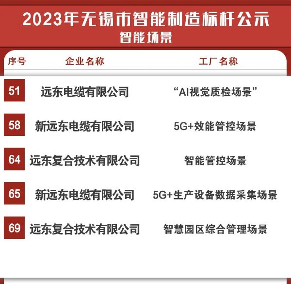 远东电缆有限公司“AI视觉质检场景”、新远东电缆有限公司“5G效能管控场景”、远东复合技术有限公司“智能管控场景”“智慧园区综合管理场景”、新远东电缆有限公司“5G+生产设备数据采集场景”被拟定为无锡市智能制造标杆企业“智能场景”。