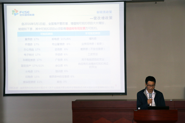 智慧能源财务资金部总账会计任建夕解读了“营改增”政策。自今年5月1日起,国家全面推开营改增试点工作,标志着我国财税体制改革迈出了重要一步。“营改增”政策的实施,有利于减少重复征税,降低企业成本和税收成本,增加经济发展动力,促进经济可持续发展。智慧能源高级总监兼财务副总监欧阳坚详细介绍了增值税抵扣范围、具体抵扣办法等。