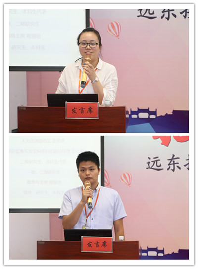 远东智慧能源投资人、资深总监兼远东买卖宝网络科技有限公司副总经理王小强,集团人力资源部副总监孟祥波各自从招聘流程、项目计划、培养目标、绩效管理、职业发展等方面阐述了营销本科生培养方案、研究生培养项目。