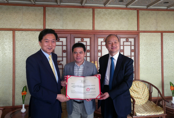 鸠山友纪夫(左)、胡智荣(右)为蒋锡培(中)颁发委任状