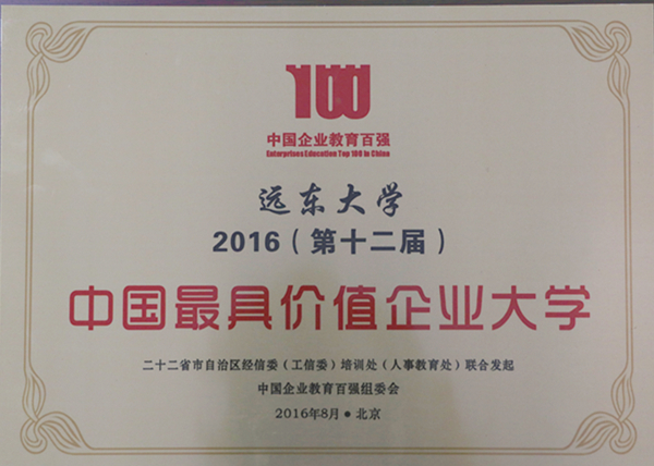 8月29-30日第十二届中国企业教育百强年度盛典暨2016中国企业培训论坛在北京隆重举行。远东大学第三次被授予“第十二届中国最具价值的企业大学”和“第十二届中国企业教育先进单位百强”的荣誉称号。远东控股集团总裁助理、首席行政官周东佼,投资人、远东大学营销学院院长助理杜洁作为获奖单位代表出席盛典。