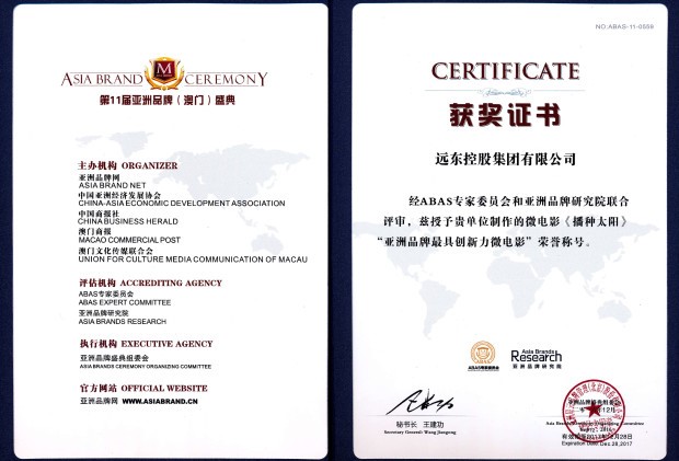 近日,由中国经济发展协会、亚洲品牌网、中国商报、澳门商报、澳门文化传媒联合会共同举办的“2016第11届亚洲品牌(澳门)盛典”隆重举行。会上,“2016影响中国品牌50强”评选结果揭晓,远东控股集团与国家电网、华为、阿里巴巴、万达、工商银行等品牌共同上榜,集团创始人、董事局主席、党委书记蒋锡培荣获“2016影响中国品牌50人”。远东精心制作的微电影——《播种太阳》获“亚洲品牌最具创新力微电影”荣誉称号。集团高级顾问龚苗林代表远东参会并上台领奖。