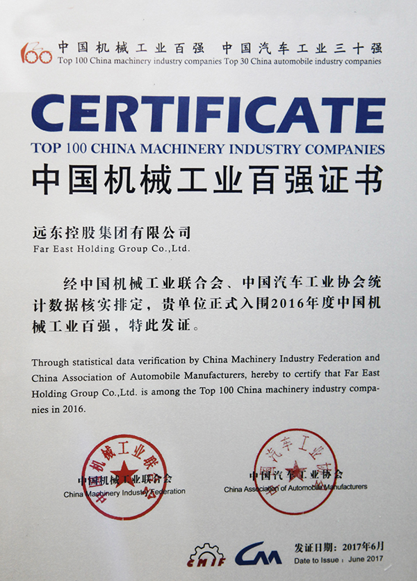 据悉,中国机械工业联合会、中国汽车工业协会联合发布2016年度中国机械工业百强、汽车工业三十强名单。远东控股集团有限公司位列第十三名。统计显示,机械工业百强、汽车工业三十强企业2016年营业收入合计6.46万亿元。从名单发布十三年来的情况看,2016年入围企业的营业收入总量创出新高,整体发展势头良好。
